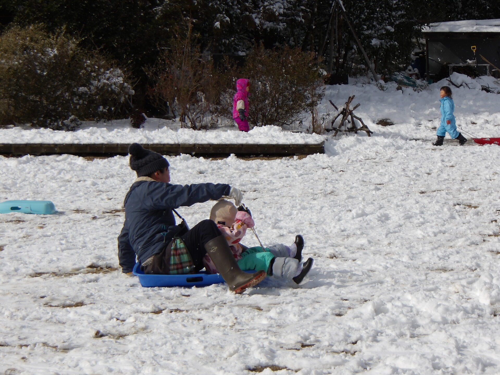 スキーウェア―で登園した子達はすぐに山へそりを持って駆け上がり、何度登って滑ったのでしょう。